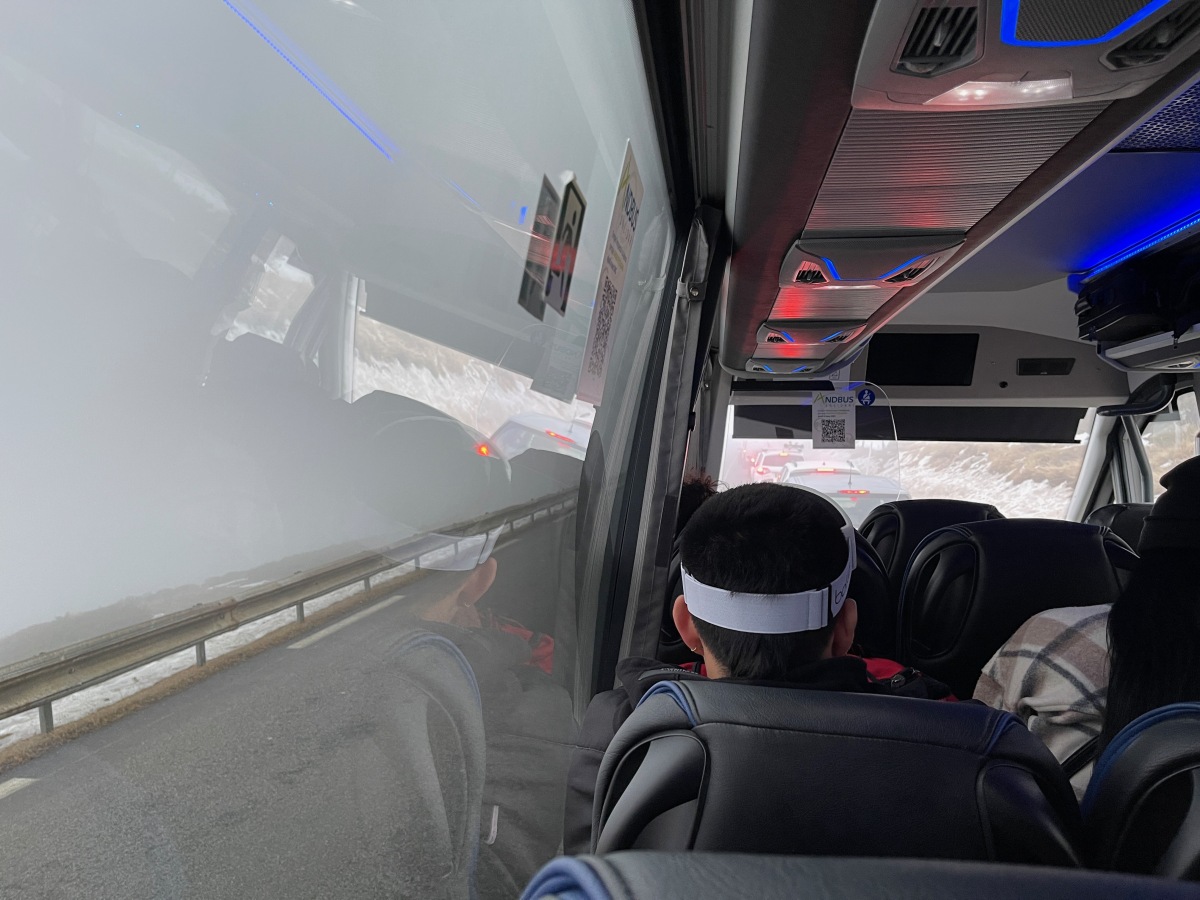 町に到着。ここで数人の客が乗ってくる。この辺でスキーをしていたみたい。