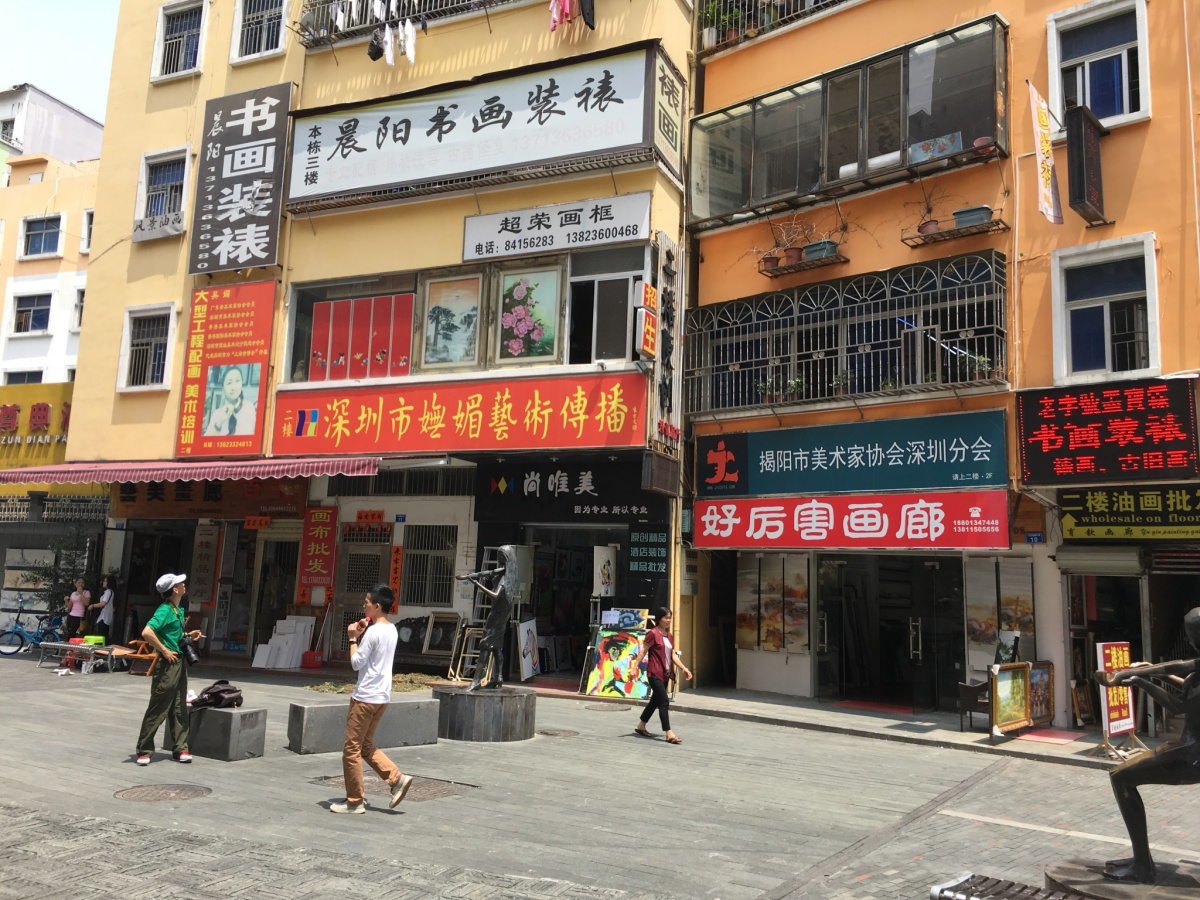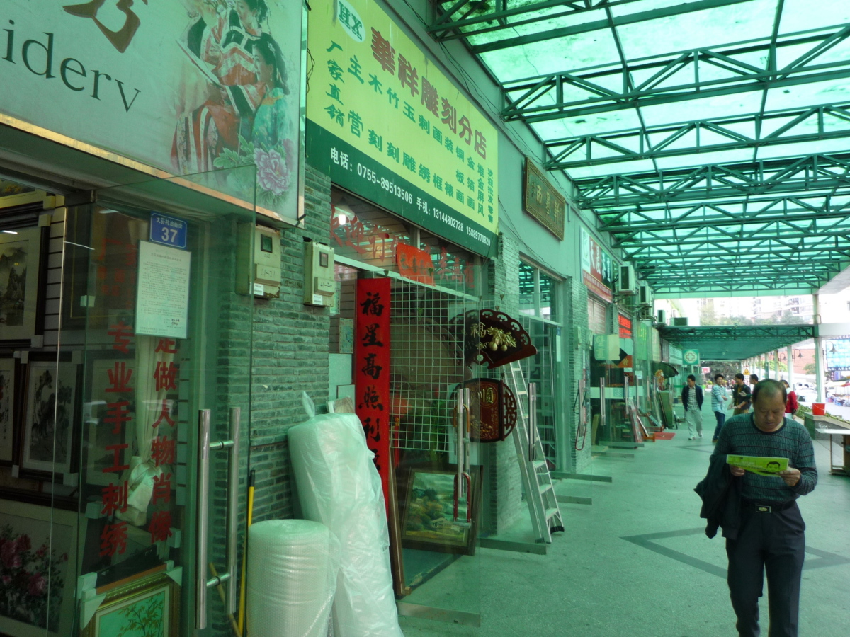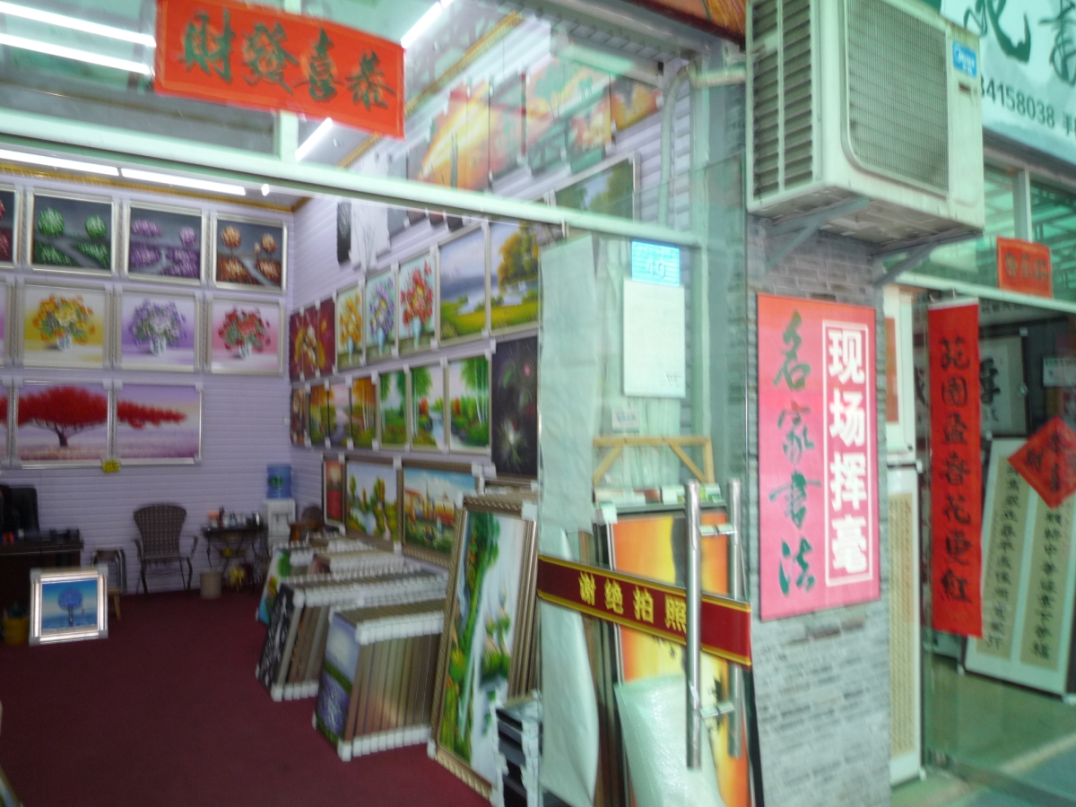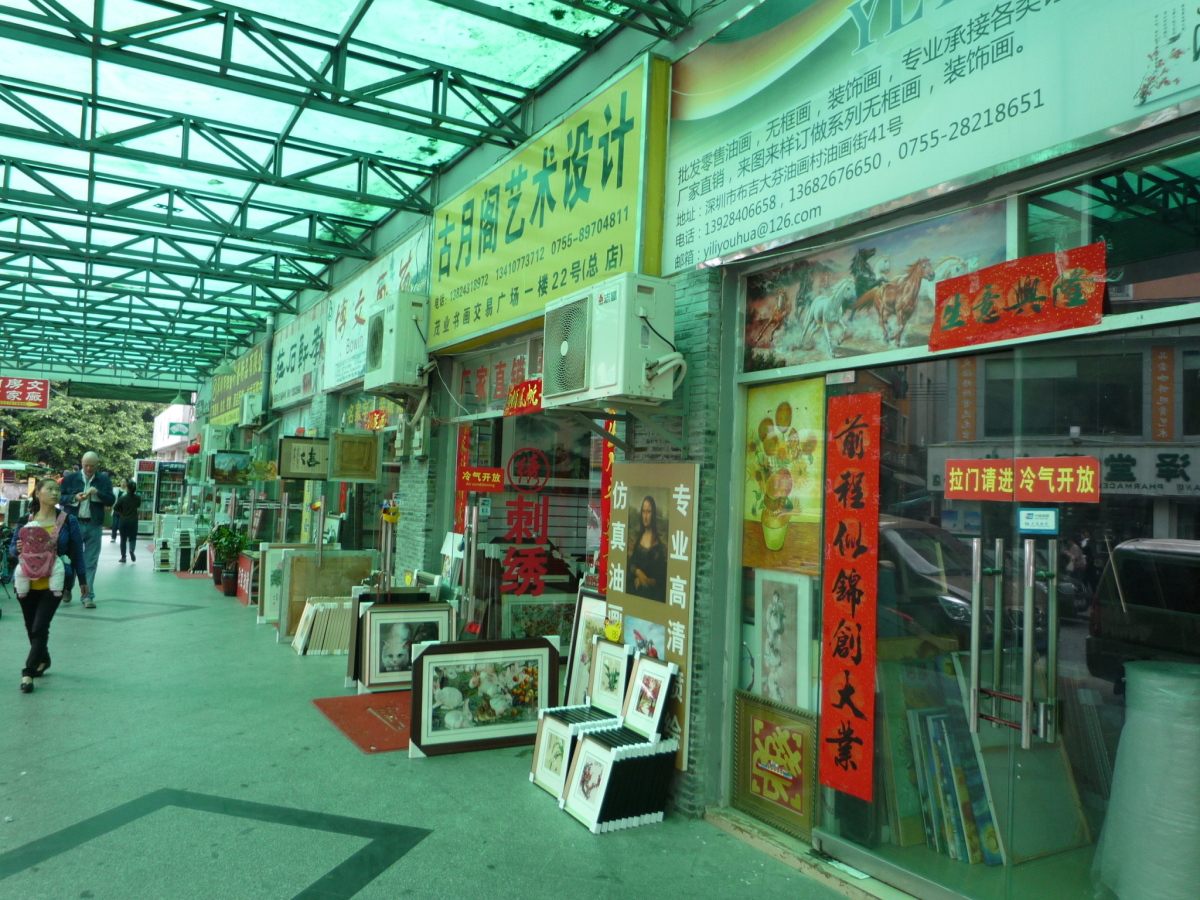 龍崗区布吉街道大芬村。 油絵に限らず、水墨画やオブジェ、画材などを売っている。 フェイク品で有名だったが、そういう物は表立っては売っていない。