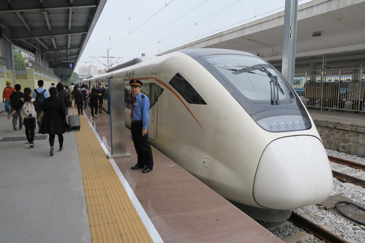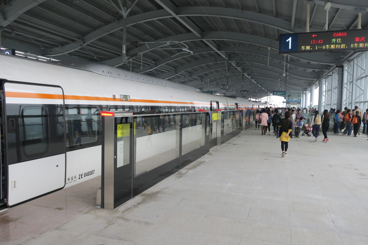 帰りは高鉄に乗る。肇慶東駅は広州南駅から広西方面を結ぶ高鉄の駅。 すぐ隣に広佛肇城際鉄路の駅である鼎湖東駅がある。