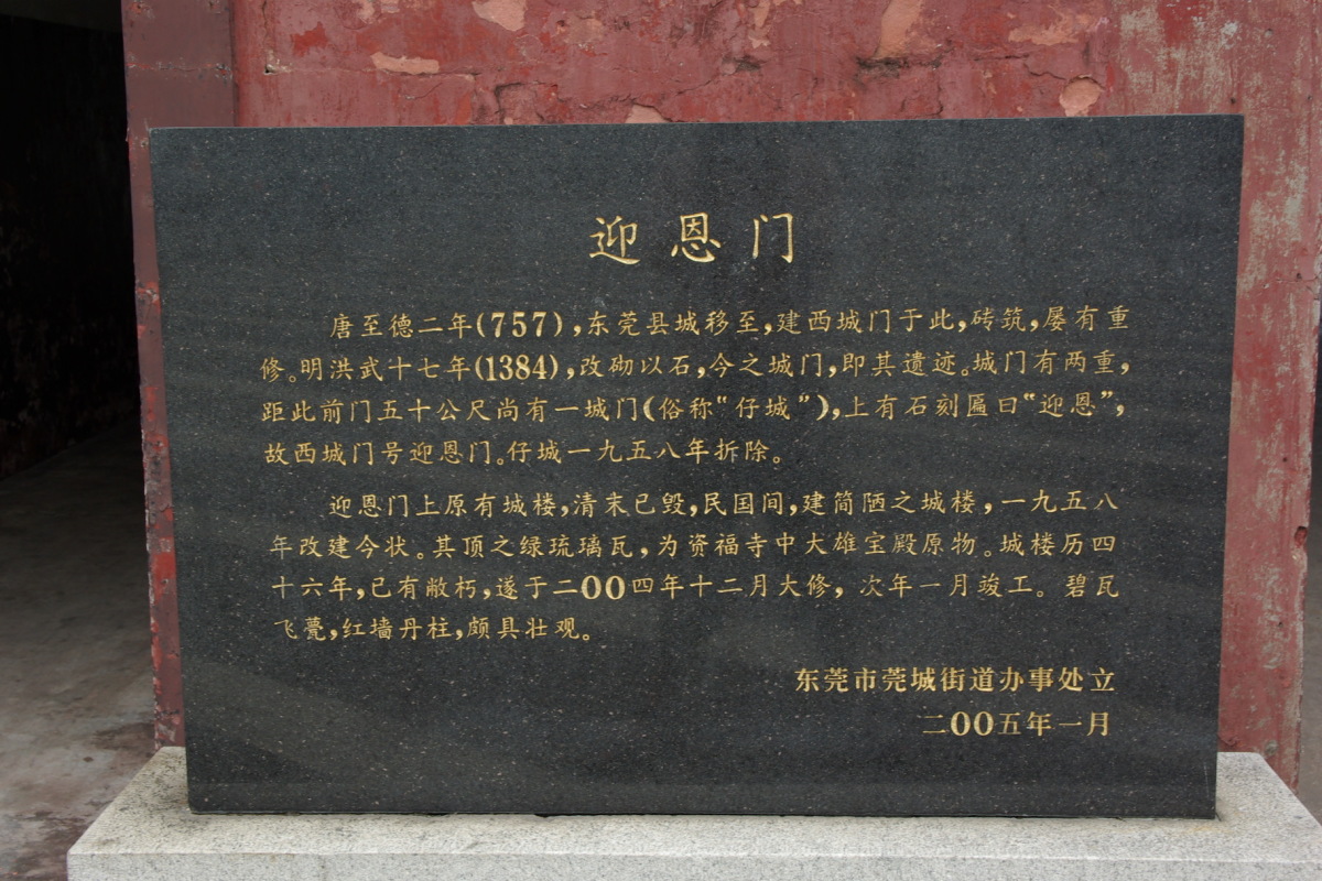 東莞市莞城区。 東莞県城の西門である迎恩門が残っている。 あと、人民公園に城壁が残っているらしいが見つけられなかった。