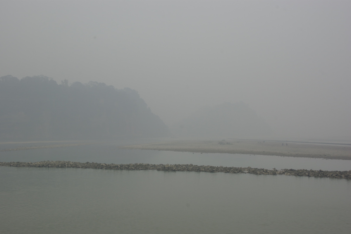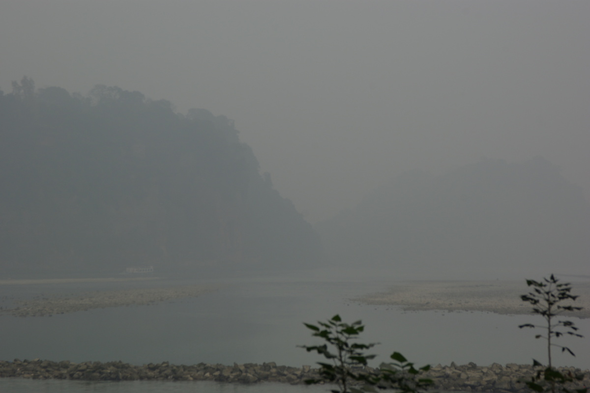川沿いの壁を彫って造られた石仏。 川の対岸に楽山古城の城壁が見える。