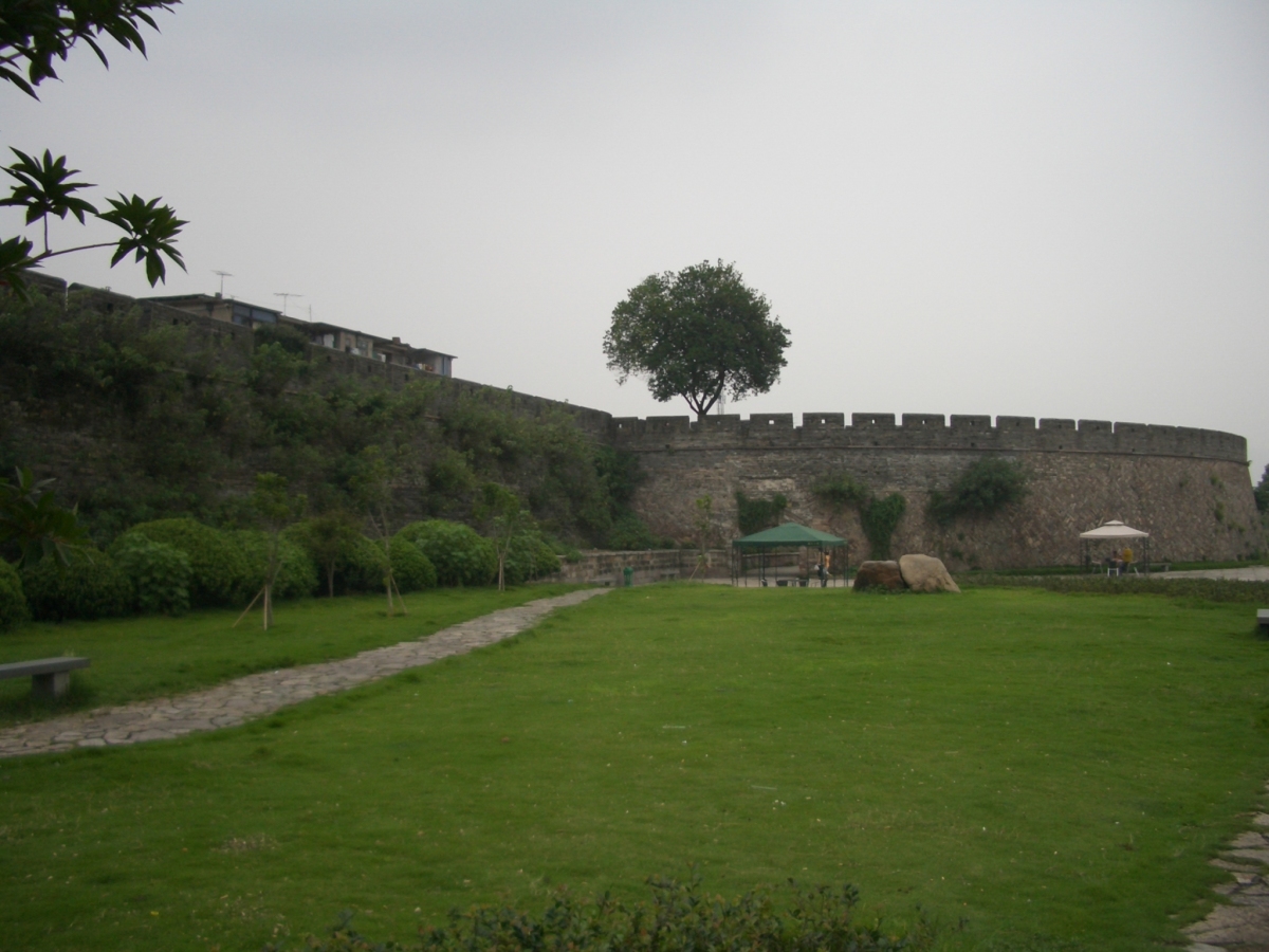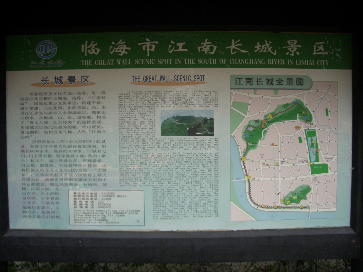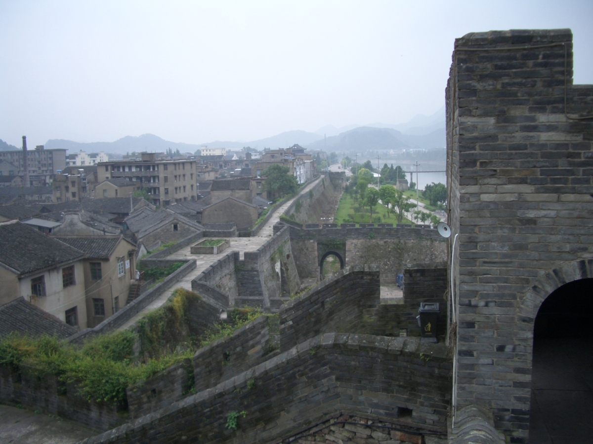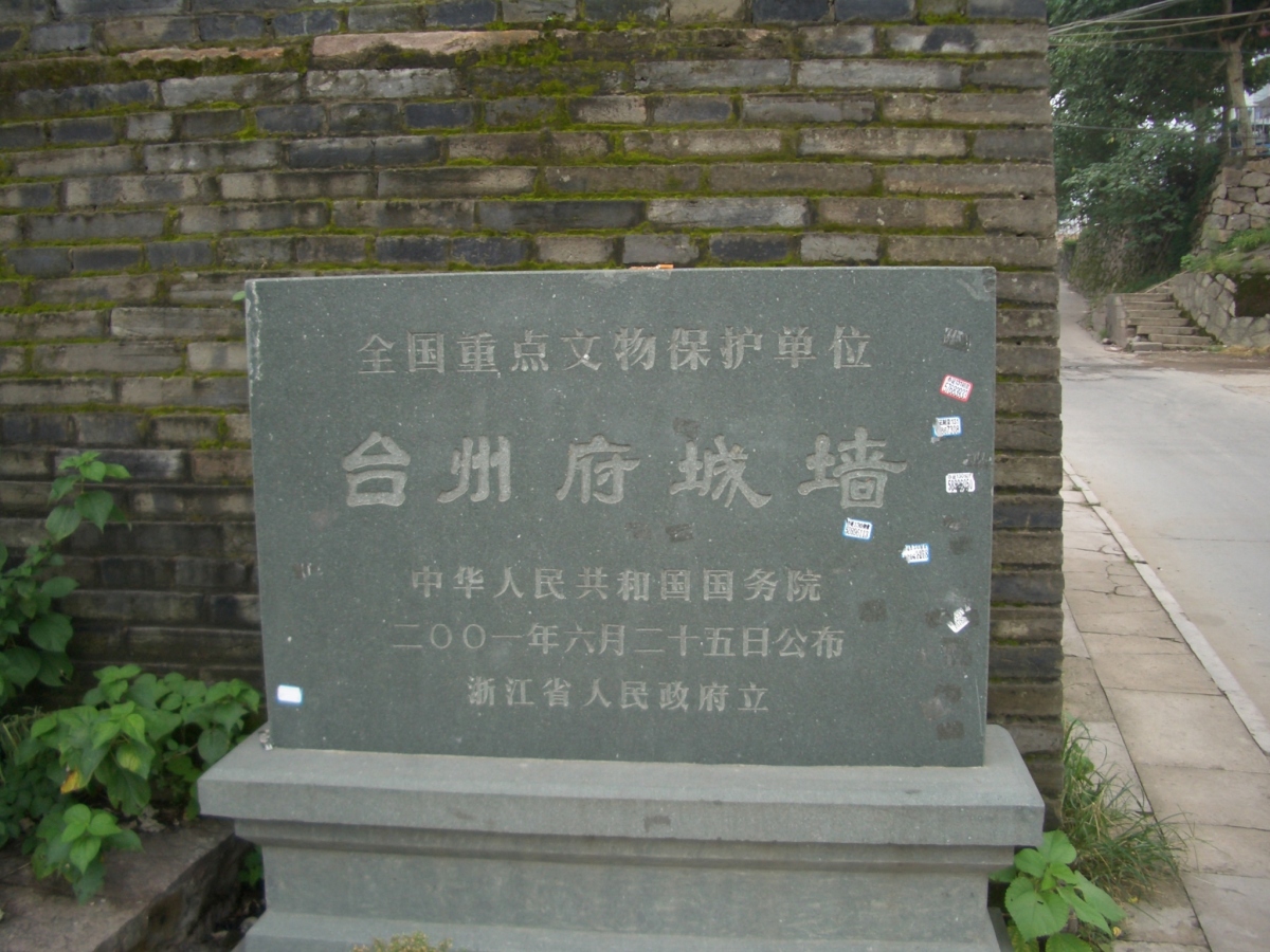 台州市下の臨海市に台州府城があった。 南側と西側は川沿いに、北側は山の尾根に沿って城壁がある。東側は城門だけが残っている。