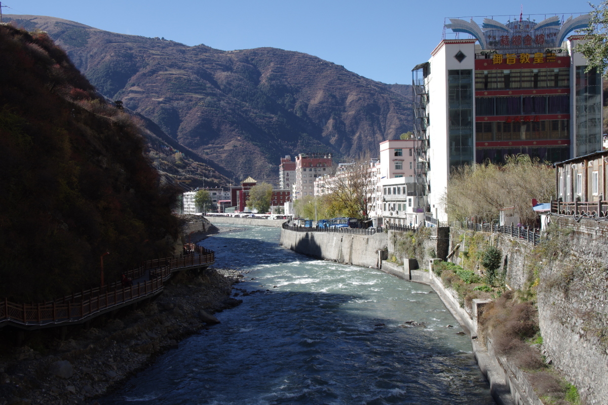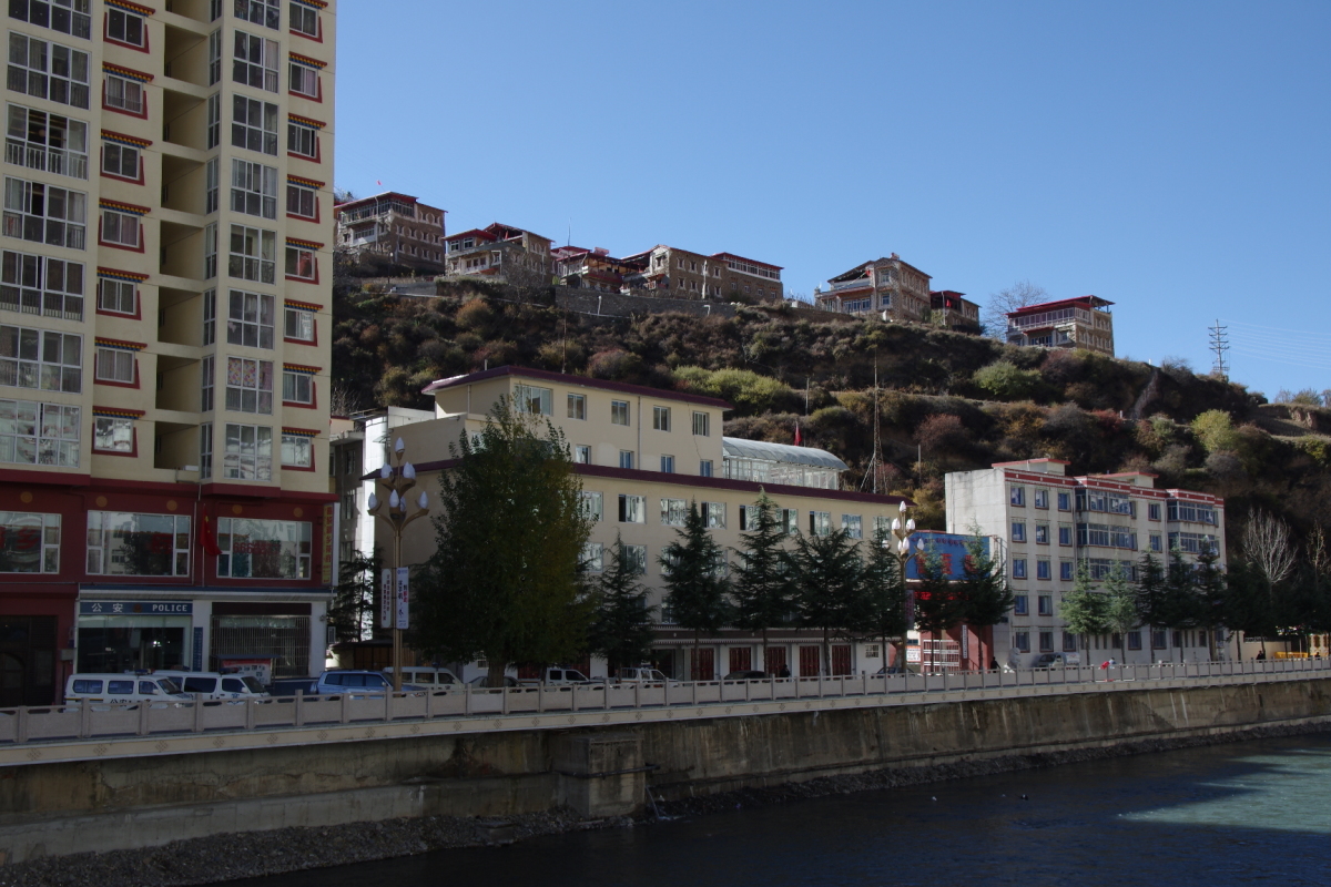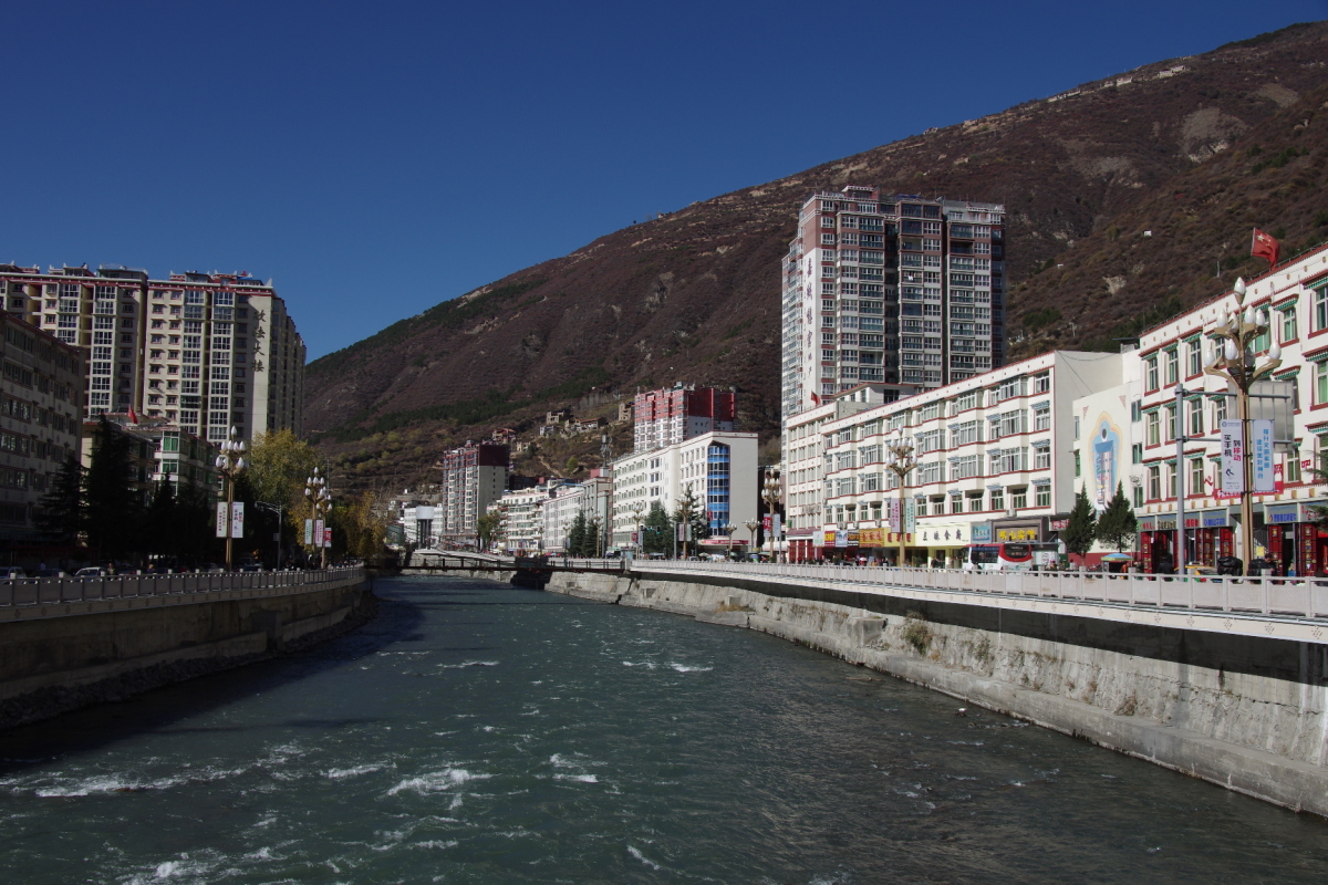 阿壩州の中心地。 谷底の川沿いにある細長い町。
