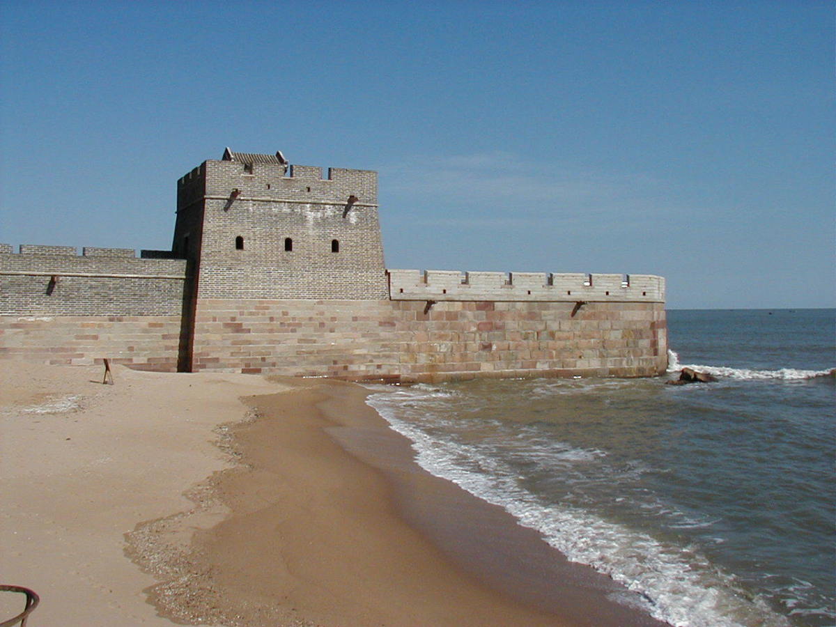 長城が海で途切れる。 だいぶん修復されている。