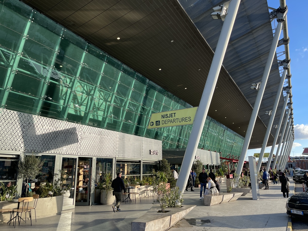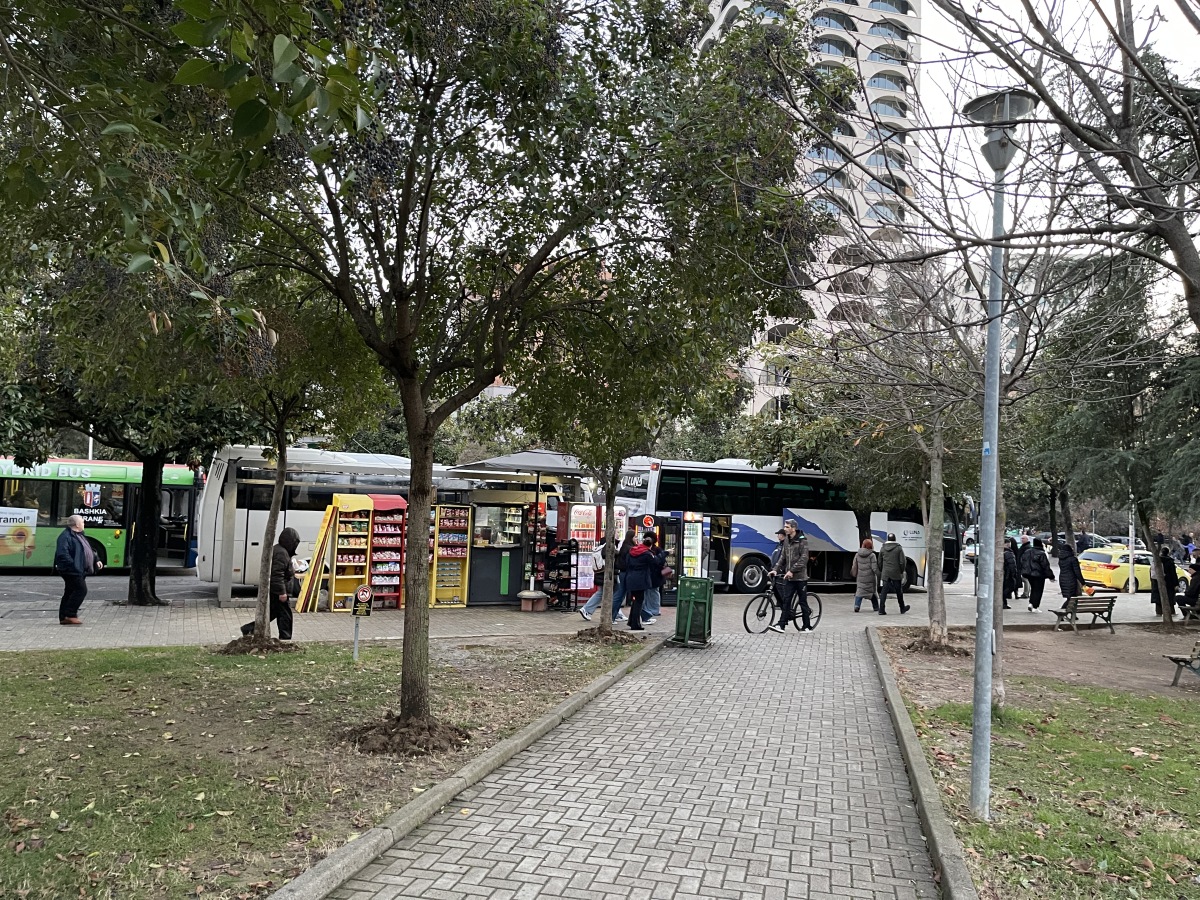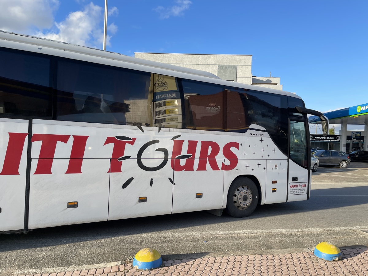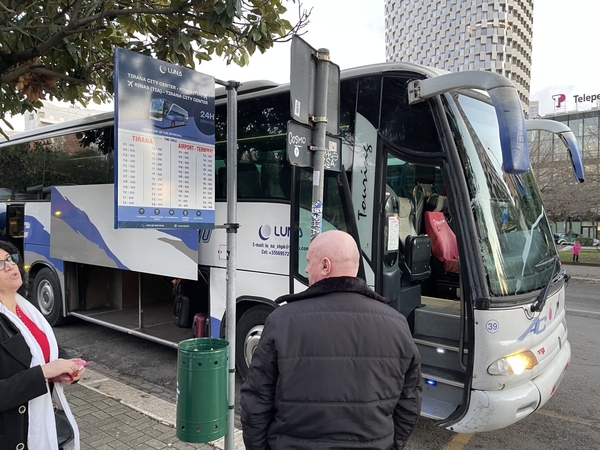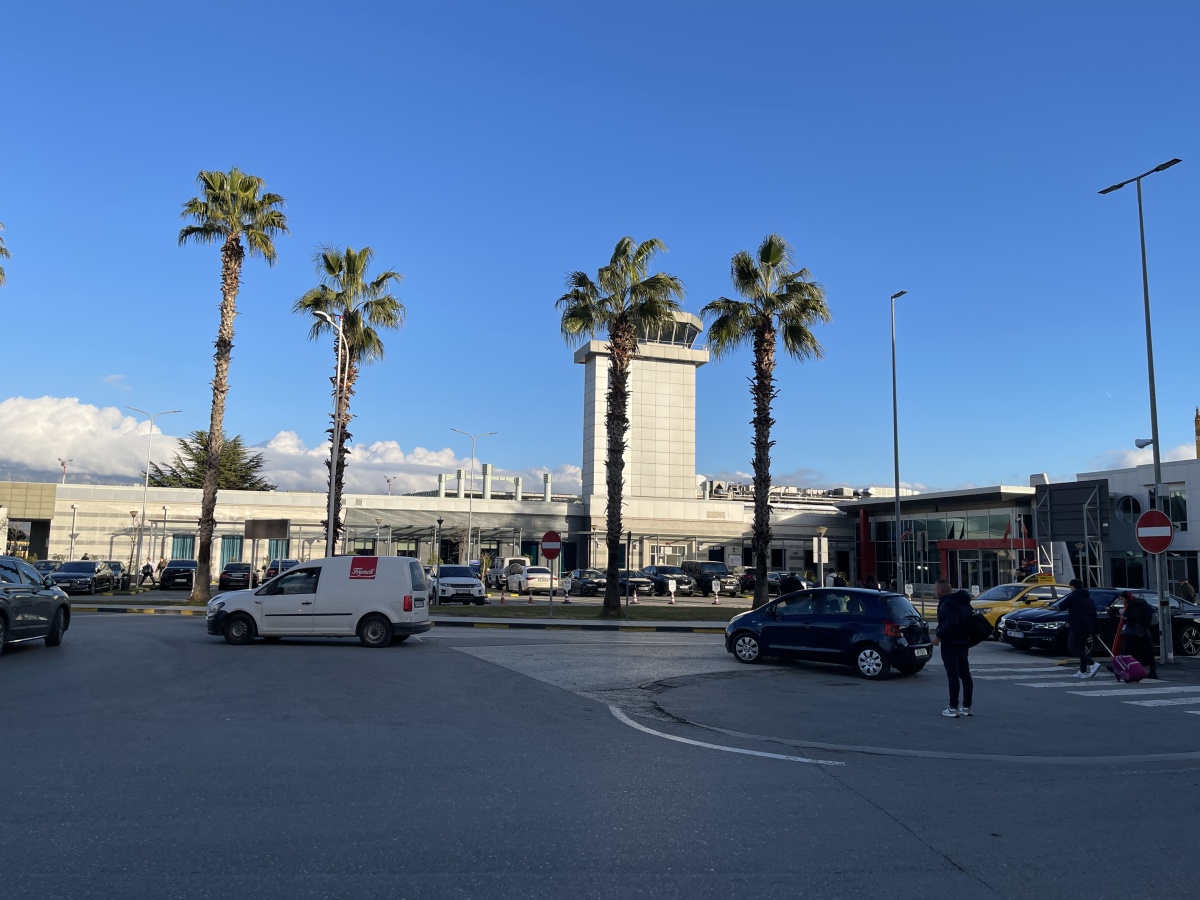 コソヴォからのバスが、ティラナ・マザーテレサ国際空港に到着。 このバスは市内まで行くみたいだが、スカンデルベグ広場までは行かないようなので、ここで下車し、空港バスに乗り換える。