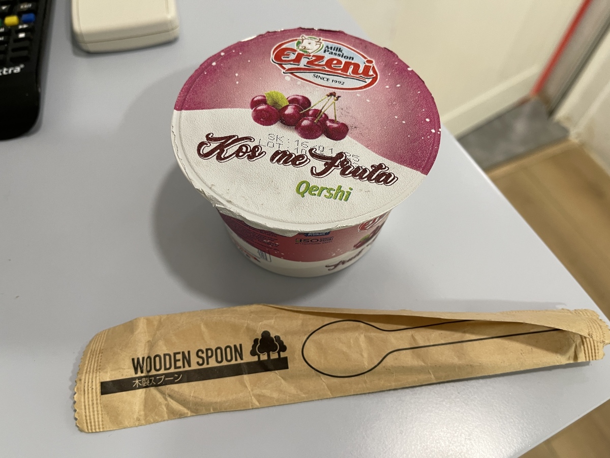 スーパーで買ったヨーグルト。スプーンは日本のイオンでいただいたもの。