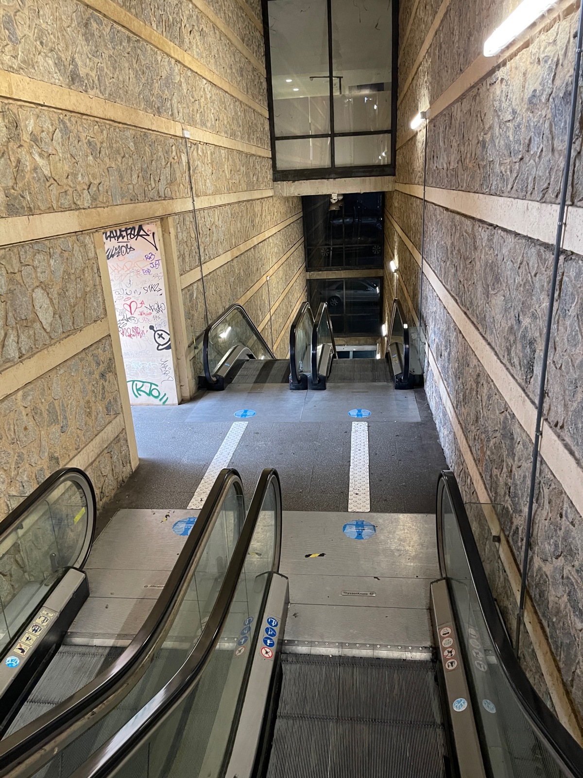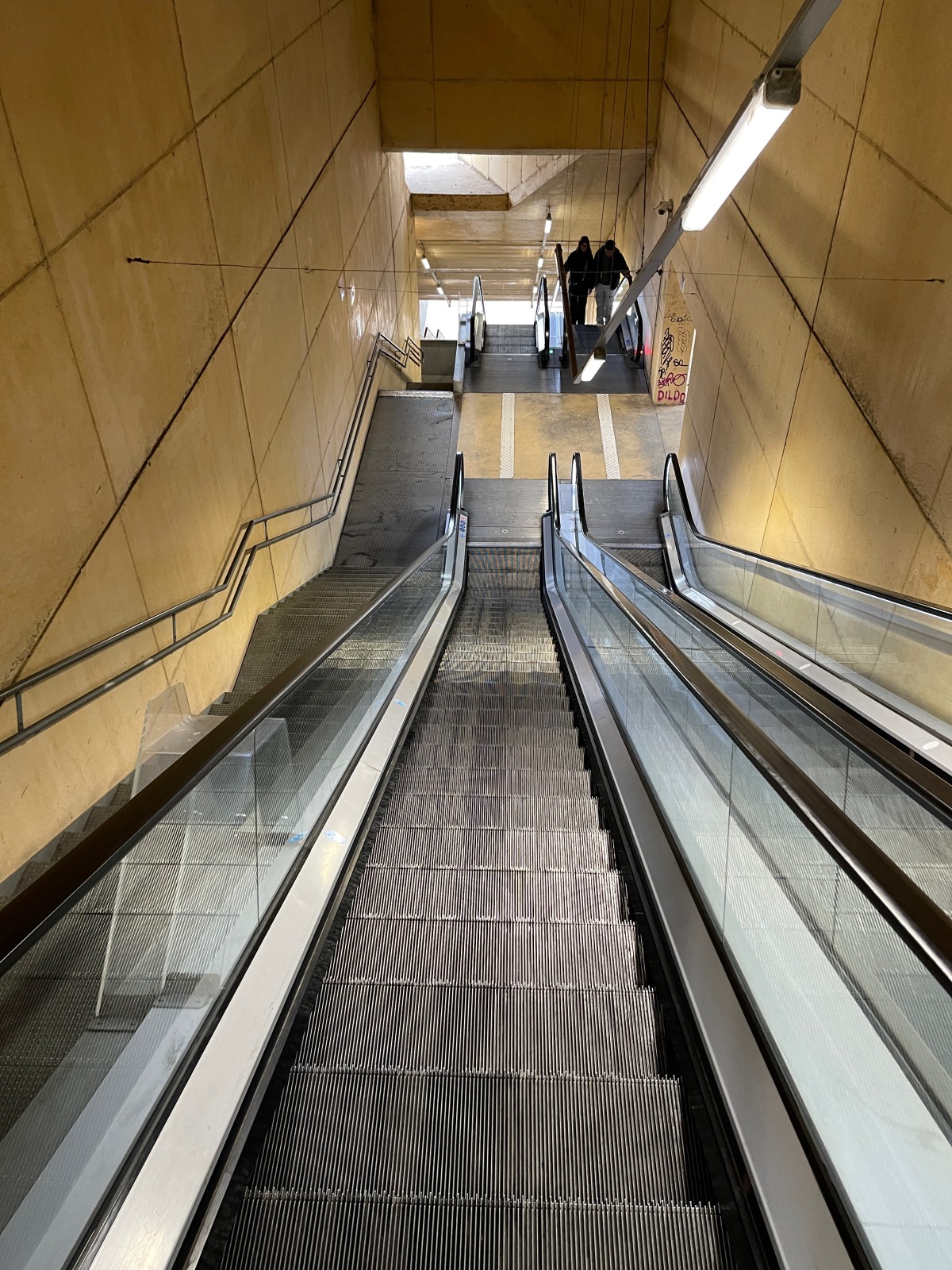 エスカレーターで丘の下へ。