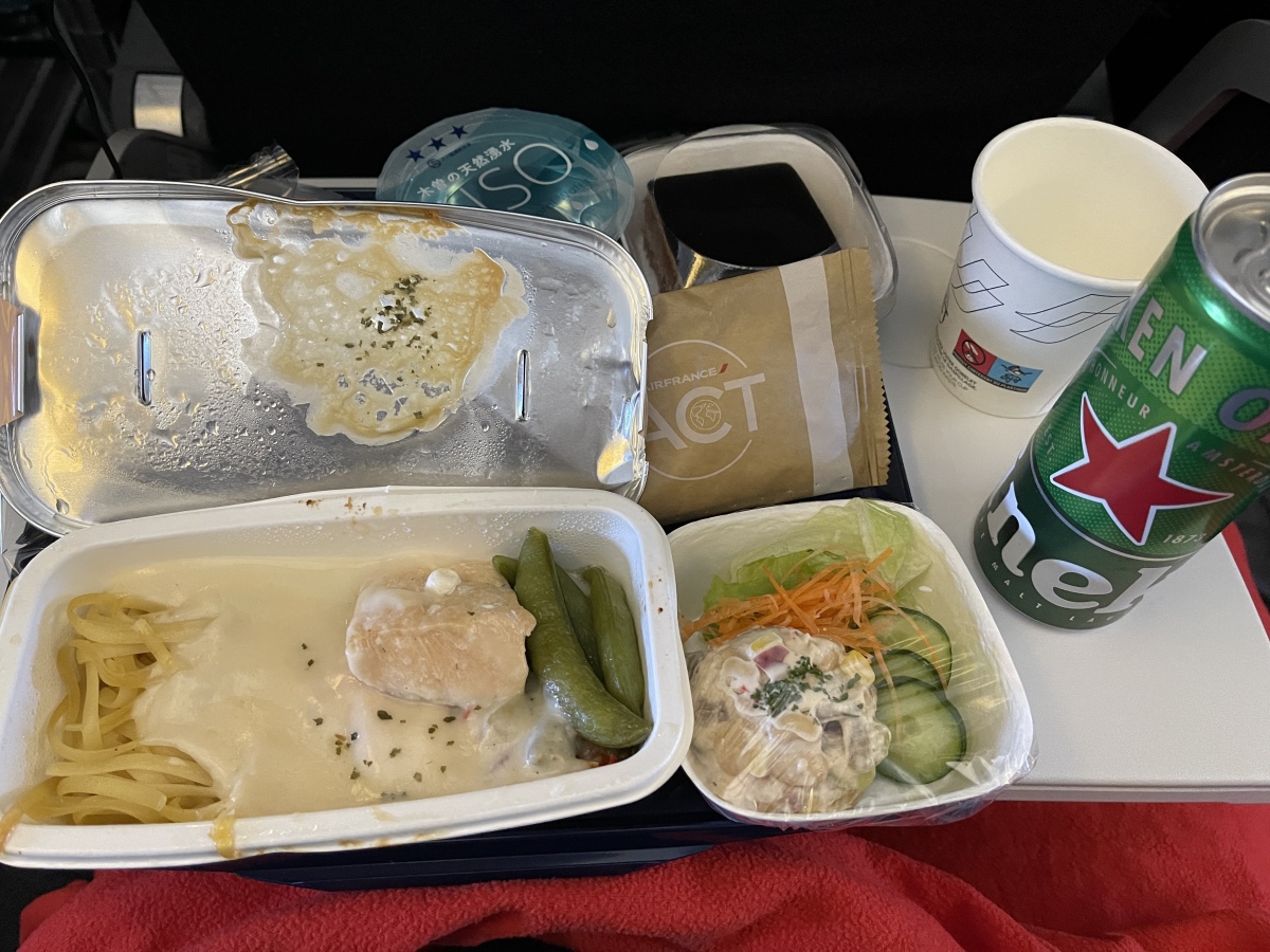 機内食。ビールは250ml缶。