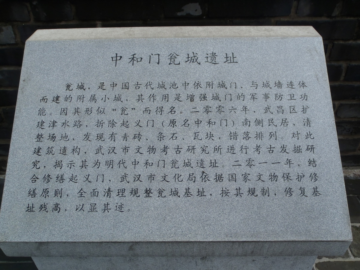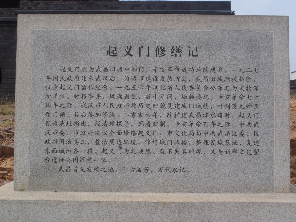 武昌区にある。 起義門とその両側の城壁が再建されている。 ただ、瓮城の基部だけは遺跡として残っている。 起義門の元々の名称は中和門で、武昌城の南門にあたる。