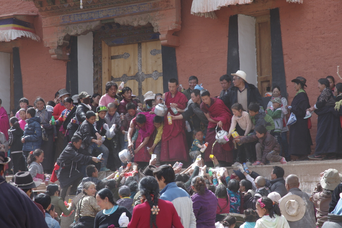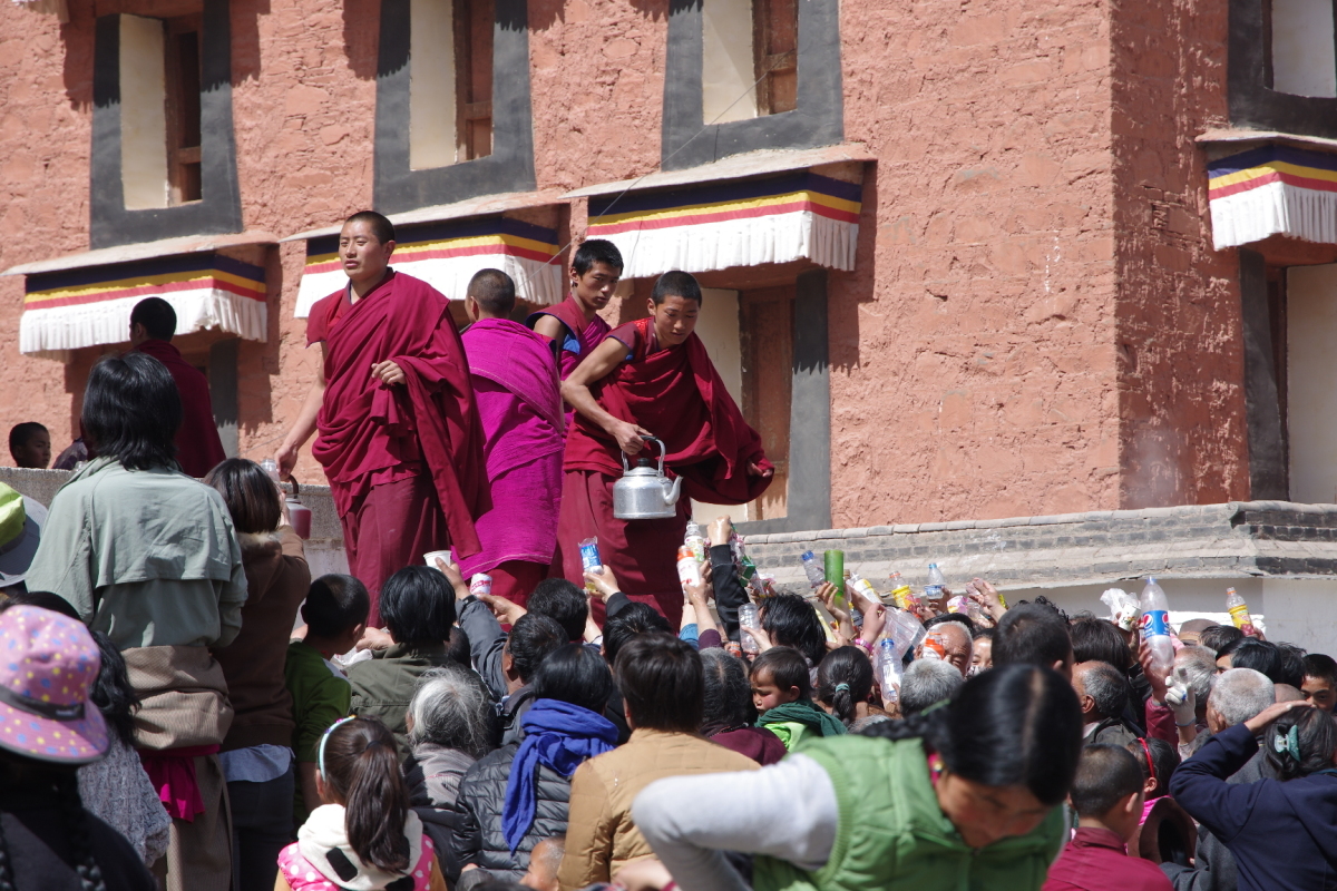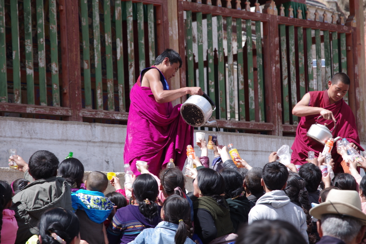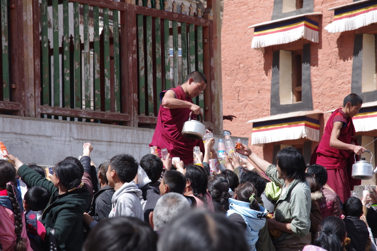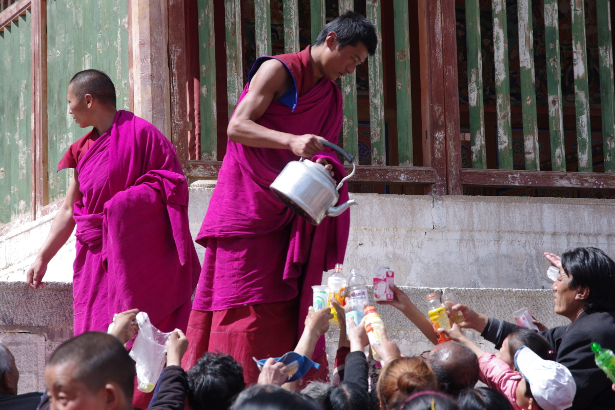若い僧侶がヤカンで水を配っている。