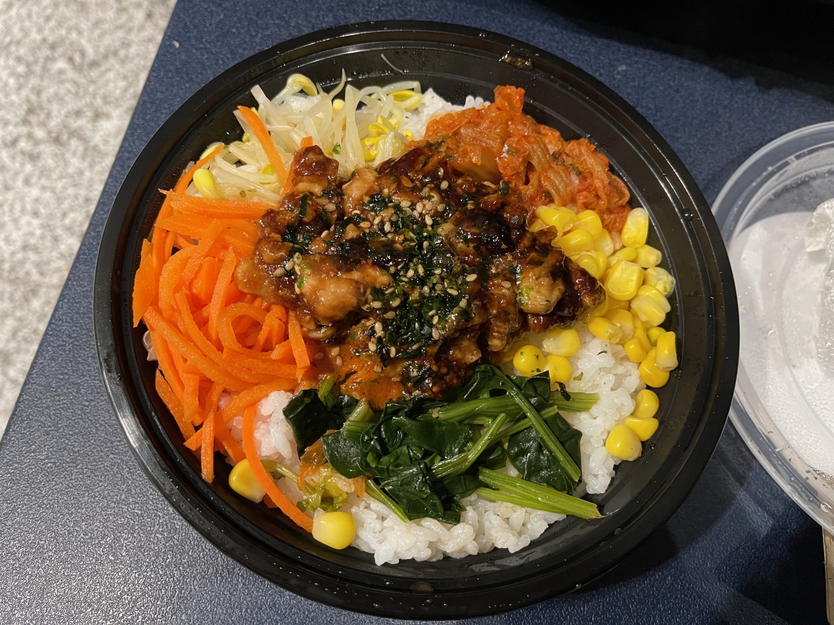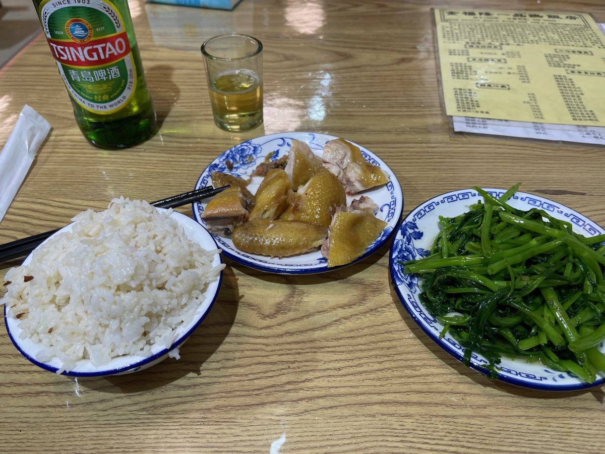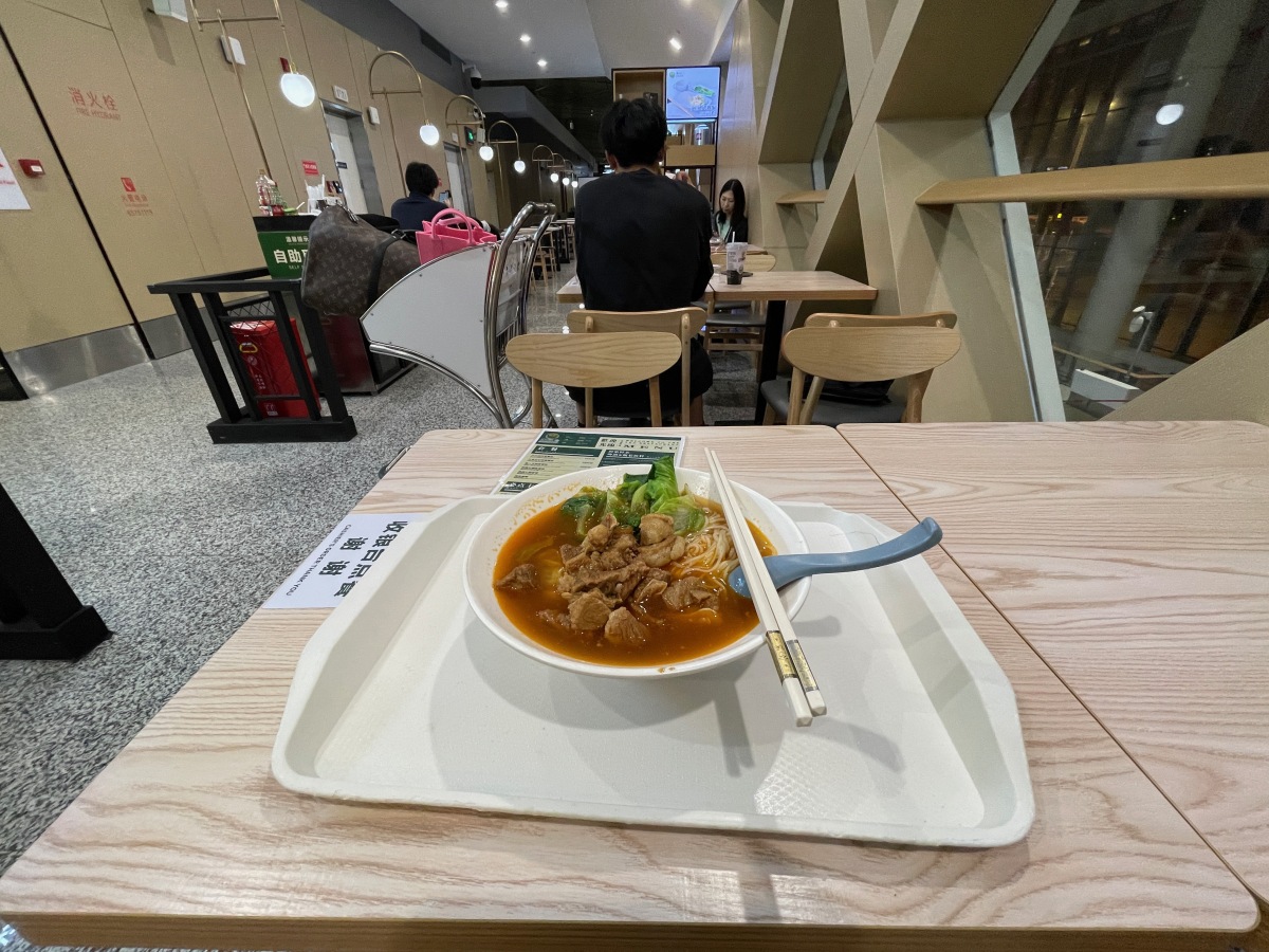 米は売り切れだったので麺。 この後、飛行機は無事に飛んで、香港で乗り換え、日本に到着。深夜便で、しょぼい機内食しかなかったので、この食事をとって良かった。